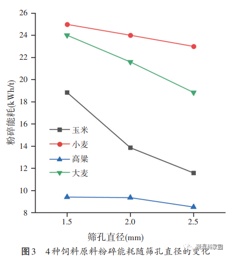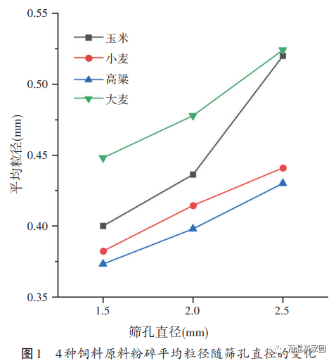 3 結(jié)論 玉米、小麥、大麥、高粱4種主要飼料原料的粉碎樣品平均粒徑均受粉碎機(jī)篩孔直徑顯著影響(P