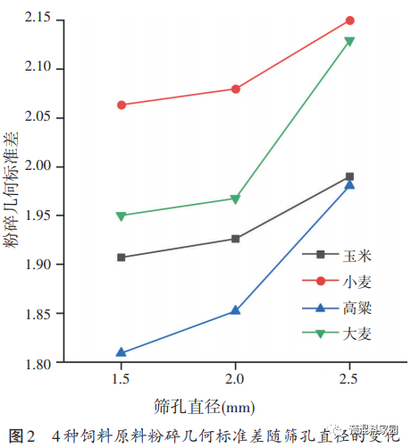2 結(jié)果與分析2.1 不同飼料原料粉碎特性的差異性2.1.1 篩孔直徑對平均粒徑及粉碎均勻性的影響飼料的粉碎粒徑和均勻度通常用幾何平均粒徑和粒度幾何標(biāo)準(zhǔn)差表示。粉碎機(jī)的篩片孔徑、篩片厚度、開孔率等都是影響粉碎粒徑的因素,而篩片孔徑大小對粉碎粒徑的影響最大。有研究表明,大麥粉碎的幾何平均粒徑受篩片孔徑顯著影響,粉碎玉米的幾何平均粒徑隨著粉碎機(jī)篩片孔徑的增大線性增加,飼料原料粉碎的幾何平均粒徑隨篩片孔徑的增加而增加。本研究中,玉米、小麥、大麥、高粱 4 種飼料原料的幾何平均粒徑均隨篩片孔徑的增大而增加,與現(xiàn)有研究結(jié)論一致[9-10]。4 種飼料原料在 3 種篩孔直徑下的平均粒徑變化規(guī)律如圖 1 所示,4 種原料均呈現(xiàn)出相同的規(guī)律,即粉碎樣品平均粒徑隨篩孔直徑的增加而增加。當(dāng)篩孔直徑由 1.5 mm 增加到 2.5 mm時 ,玉 米 的 粉 碎 平 均 粒 徑 由 400.10 μm 增 加 到520.00 μm,小麥的粉碎平均粒徑由 382.36 μm增加到 441.02 μm,高粱的粉碎平均粒徑由 373.36 μm 增加到 430.00 μm,大麥的粉碎平均粒徑由 448.23 μm增加到523.98 μm。由表2可見,4種飼料原料的粉碎樣品平均粒徑均受粉碎機(jī)篩孔直徑顯著影響(P