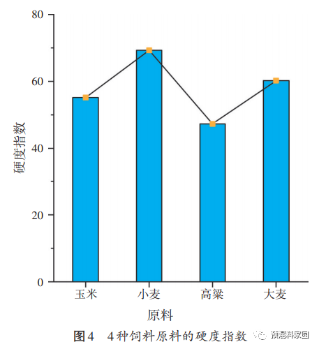 粉碎樣品粒徑與粉碎能耗的關(guān)系主要表現(xiàn)在兩方面。一方面,對于同一種飼料原料的粉碎過程,隨著篩片孔徑的減小,粉碎樣品的平均粒徑減小,飼料原料的粒徑減小比(飼料粉碎前平均粒徑與粉碎后平均粒徑的比值)越大,粉碎時需要的破裂能越多,由此增加粉碎機(jī)的能耗。另一方面,在同一孔徑篩片下,粉碎樣品的平均粒徑卻不盡相同,這是由于原料的抗破碎性的差異導(dǎo)致的,可以認(rèn)為 4種飼料原料在本試驗條件下,小麥最難粉碎而高粱最易被粉碎。2.1.3 原料種類對硬度指數(shù)的影響飼料原料的硬度指數(shù)可以作為其“軟”和“硬”分類指標(biāo),這與粉碎工藝中對飼料原料“易粉碎”和“難粉碎”的定性相近,而這又與粉碎能耗有著密切的關(guān)系[12-13]。