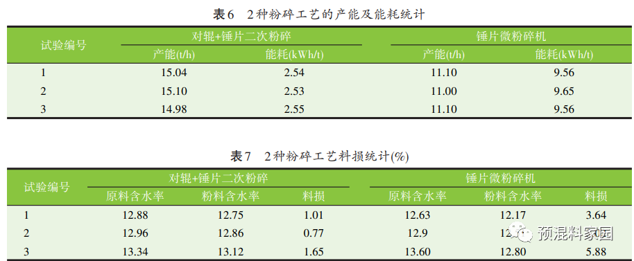 飼料廠廣義的損耗是指在進(jìn)、出廠過程中的損失,包括變質(zhì)損壞。對于原料則具體指倉儲損耗和生產(chǎn)環(huán)節(jié)料損兩類[14]。生產(chǎn)環(huán)節(jié)的料損具體分為投料殘余、除塵設(shè)備、工藝和成品計量,而工藝中的料損主要?dú)w結(jié)于粉碎導(dǎo)致的水分損失,故本研究中料損同樣定義為粉碎前后物料含水率的損失。2 種粉碎工藝的料損值見表 7。對 2 種粉碎工藝進(jìn)行多個工作日的監(jiān)測,可以得出,對輥+錘片二次粉碎工藝料損變化范圍為 0.77%~1.65%,而錘片微粉碎機(jī)料損最小值為 3.02%,最大值甚至高達(dá) 5.88%,即對輥+錘片二次粉碎工藝相較于錘片微粉碎機(jī)具有更少的料損。